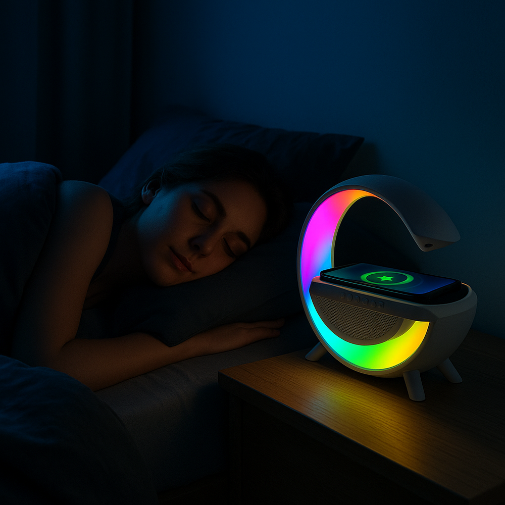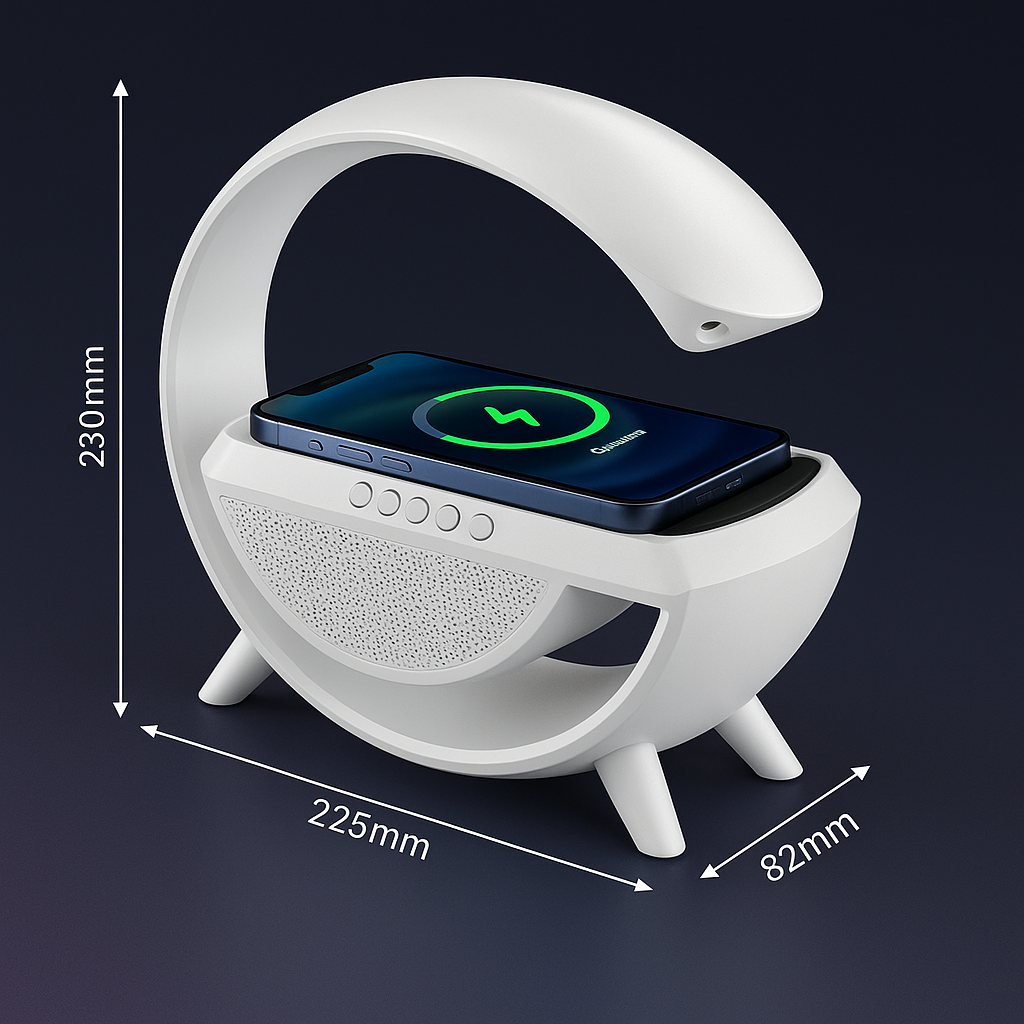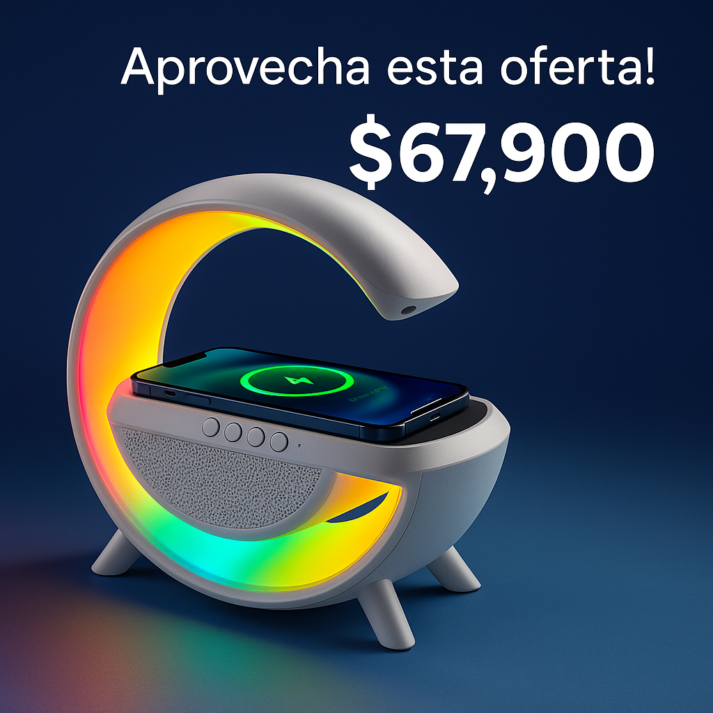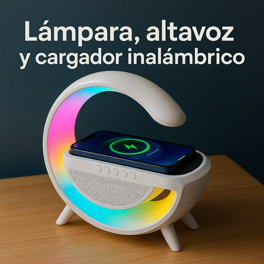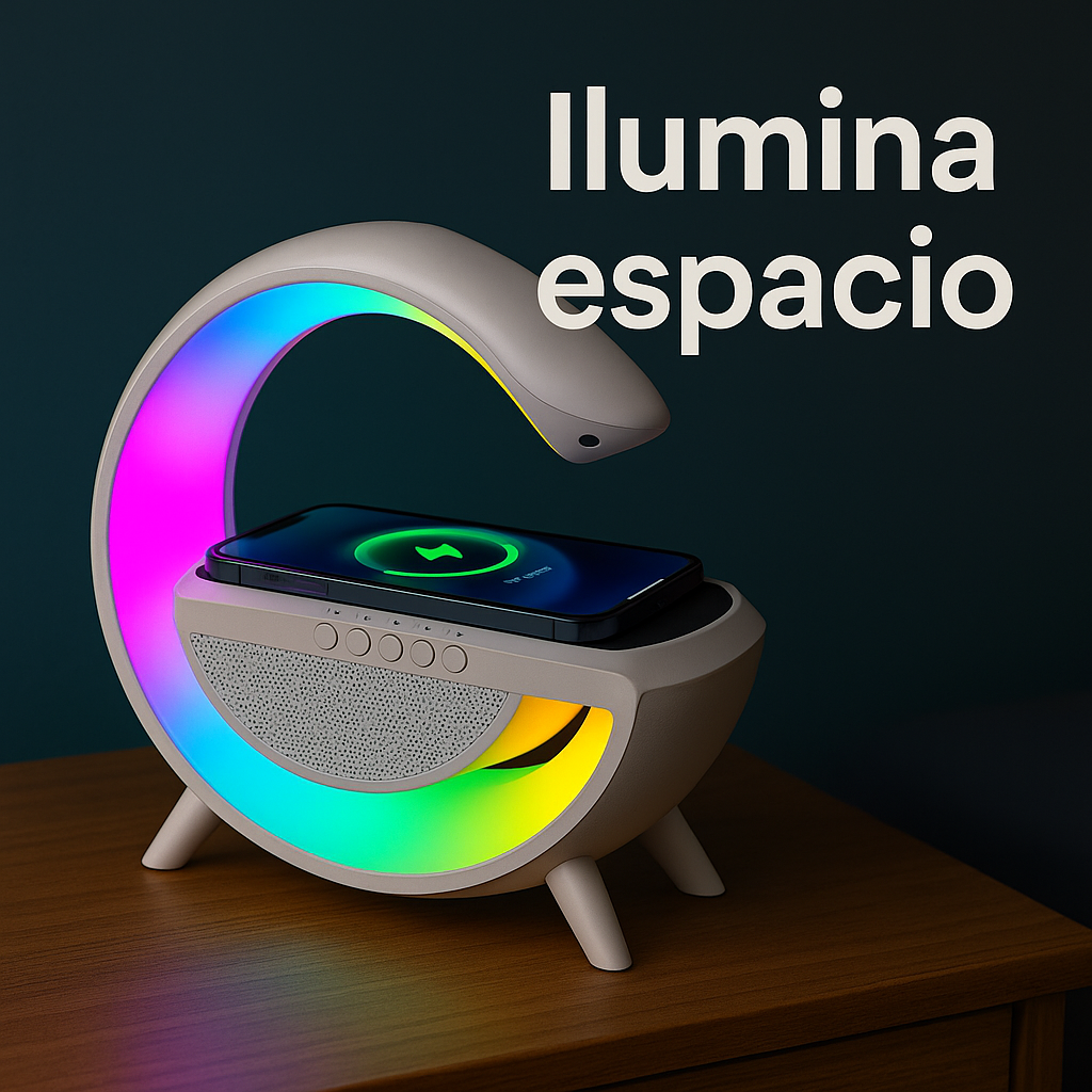 Convierte cualquier rincón en un ambiente moderno y funcional. Nuestra lámpara 3 en 1 combina luz ambiental RGB, parlante Bluetooth y cargador inalámbrico rápido para que trabajes, descanses o escuches tu música sin enredos ni cables.