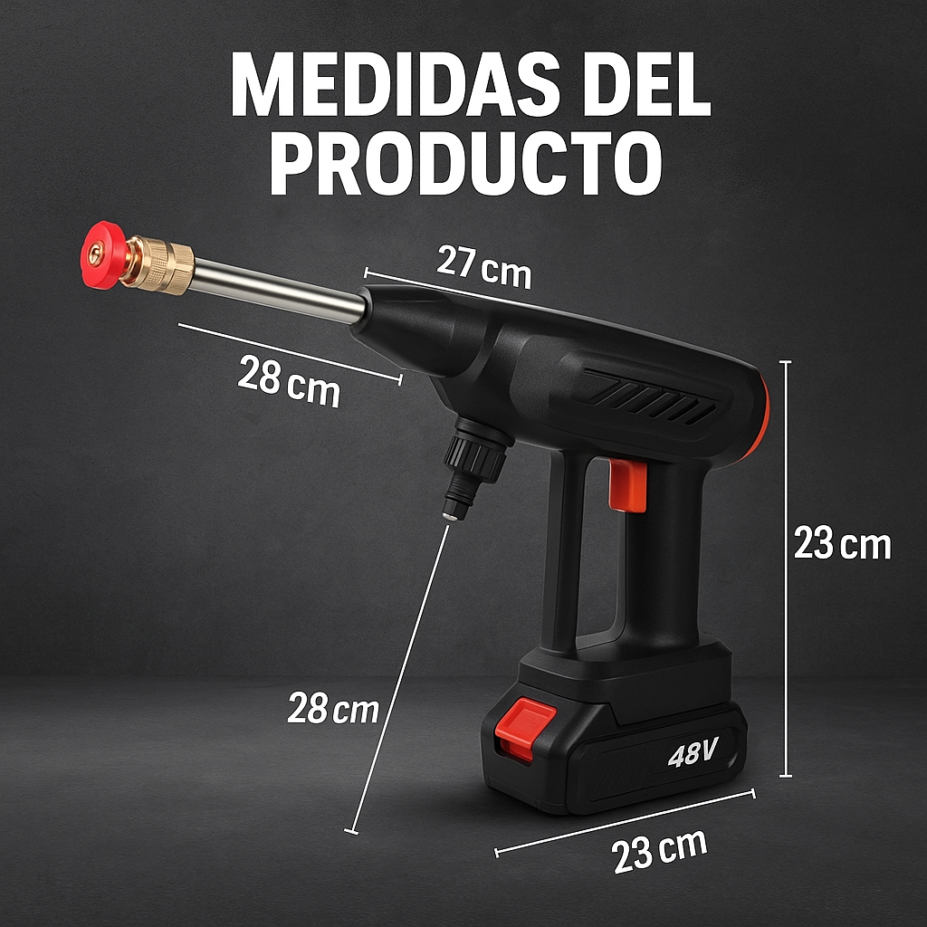 La Hidrolavadora Portátil 48V te da la potencia de una máquina profesional, pero con el tamaño y comodidad que necesitas en casa. Usa agua desde un balde, elige el tipo de chorro y limpia donde quieras. Rápido, práctico y económico.