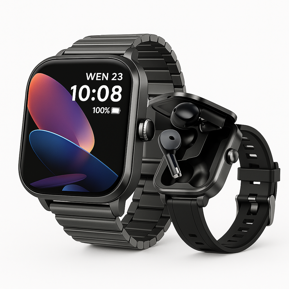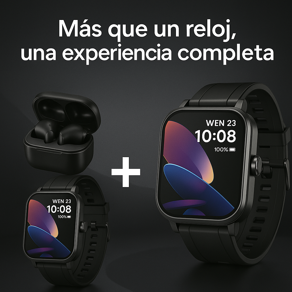 Diseño elegante, pantalla HD y audífonos integrados en el mismo reloj. Llévalo todo en tu muñeca y olvídate de cargar más estuches o cables. Tecnología real 2 en 1 hecha para tu ritmo diario.