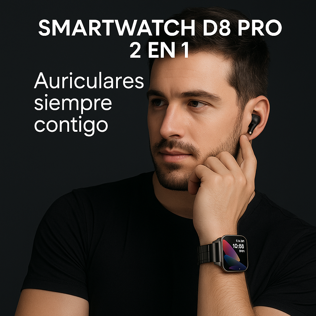 Sí, incluye el reloj D8 Pro, auriculares TWS, cable de carga magnética, manual y caja premium listos para usar.