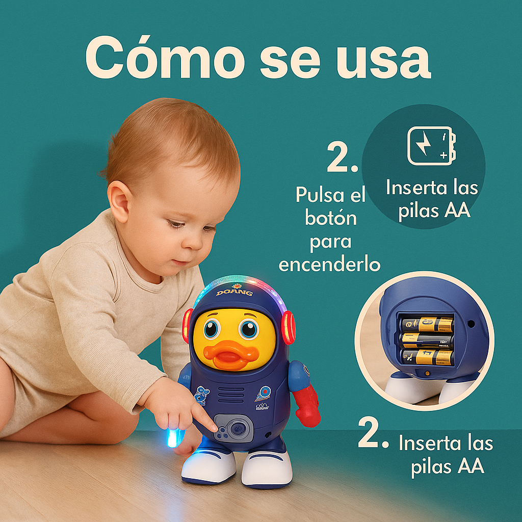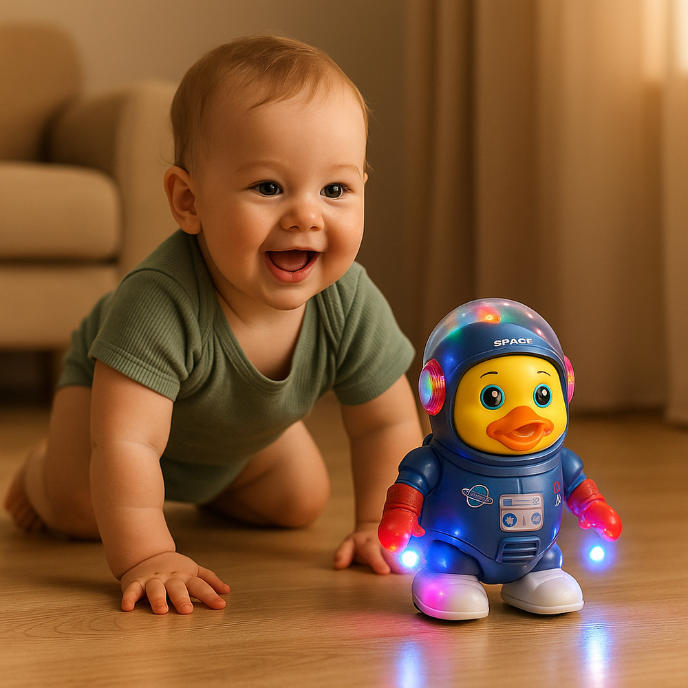 Más que un juguete bonito. El Pato Espacial estimula la vista, el oído y el movimiento, ayudando a tu bebé a gatear, explorar y aprender, mientras se divierte con luces, música y movimientos que despiertan su curiosidad natural.